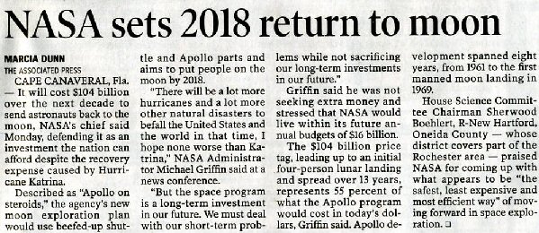 "Griffin announced last week that NASA aims to send astronauts back to the Moon in 2018 in a spacecraft that would look like the Apollo capsule...since he became NASA administrator, Griffin hasn't been so blunt about the two programs. Asked Tuesday whether the shuttle had been a mistake, Griffin said, 'My opinion is that…it was a design which was extremely aggressive and just barely possible.' Asked whether the space station had been a mistake, he said, 'Had the decision been mine, we would not have built the space station we're building in the orbit we're building it in.'"
