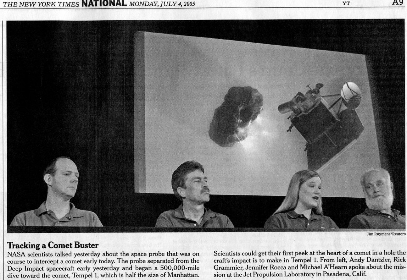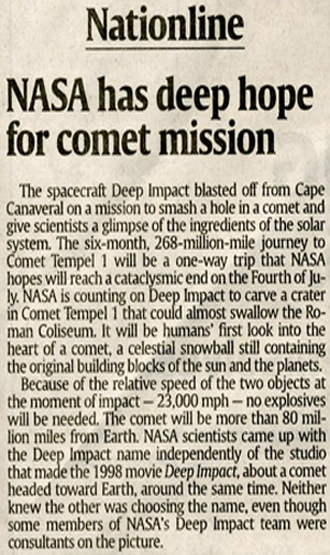 On Sunday evening, July 3, CBS 60 Minutes featured Paul Allen in a report about his "Spaceship 1" vehicle, designed to transport EMPeror Allen off the planet to the orbiting Space Station before the asteroid hits us. Just a few hours after this 60 Minutes story aired, world media covered the NASA space missile as it impacted Comet Tempel 1 shortly before 2 a.m. EST on the Fourth of July. NASA named their space squirt gun "Deep Impact" after Paul Allen's 1998 comet movie (his reply to Rock Prophecy). In fact, this NASA charade called Deep Impact is a public relations ploy to train us to think NASA can pulverize a comet or knock it off course, as suggested by the "Comet Buster" headline in the New York Times article above. And CBS Evening News persuades us today that "now the idea of deflecting a massive space ball threatening Earth isn't just the stuff of science fiction, like the movie Deep Impact…a comforting thought…it sure is a lot easier to change the course of something, if you know what it is that you're changing the course of."